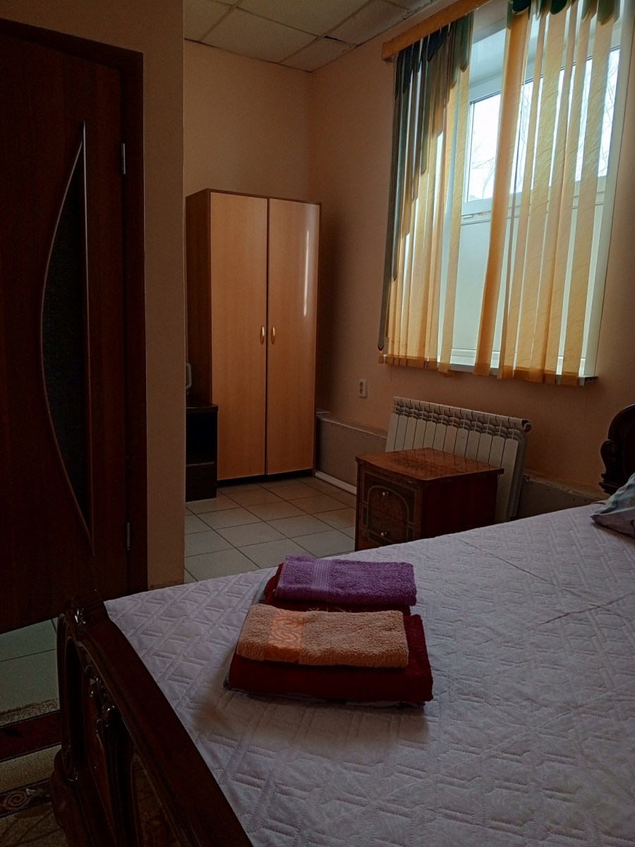 В номере: двуспальная кровать, стол, стулья, шкаф, тумбочка, телевизор, гладильная доска, утюг.