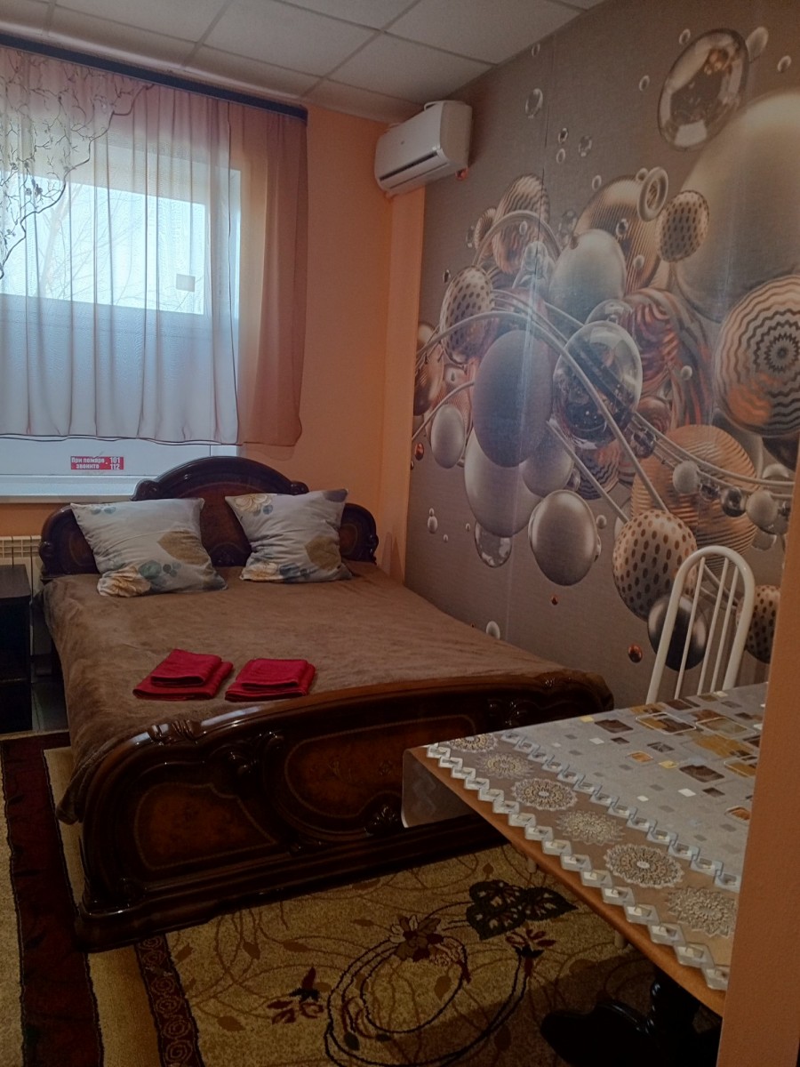 В номере: двуспальная кровать, стол, стулья, шкаф, тумбочка, телевизор, гладильная доска, утюг.