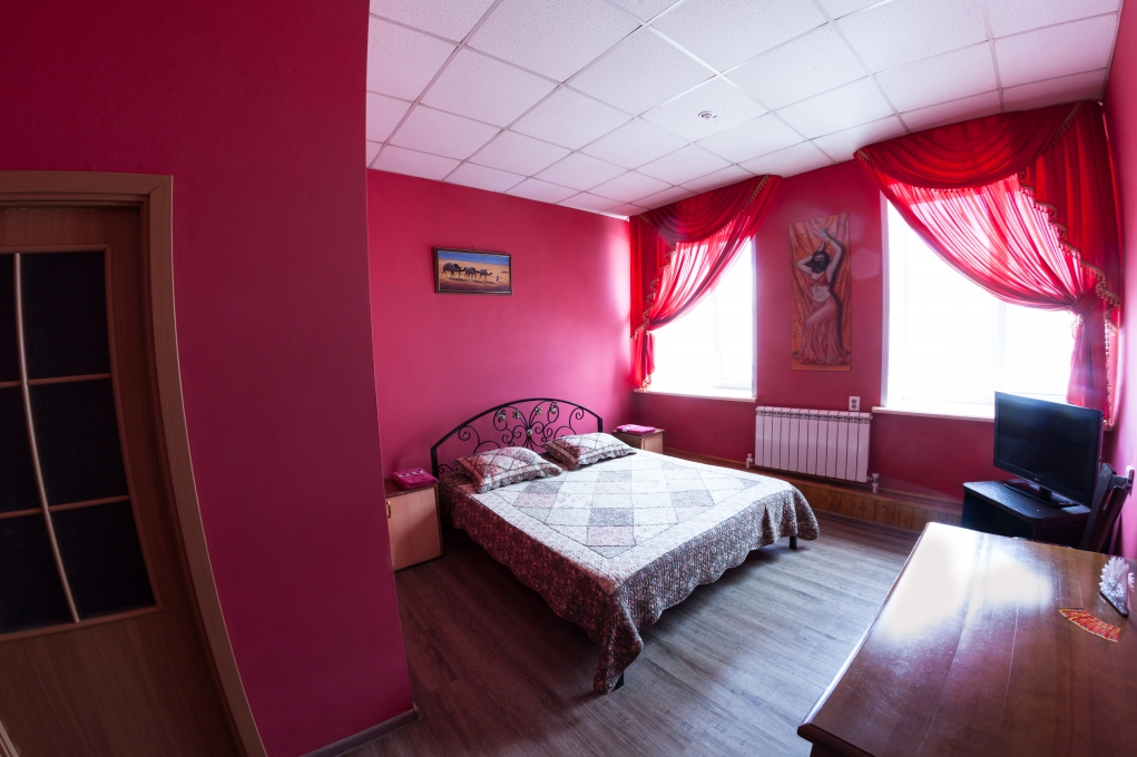 В номере: двуспальная кровать, стол, стулья, шкаф, прикроватные тумбочки, тумбочка, телевизор, гладильная доска, утюг.